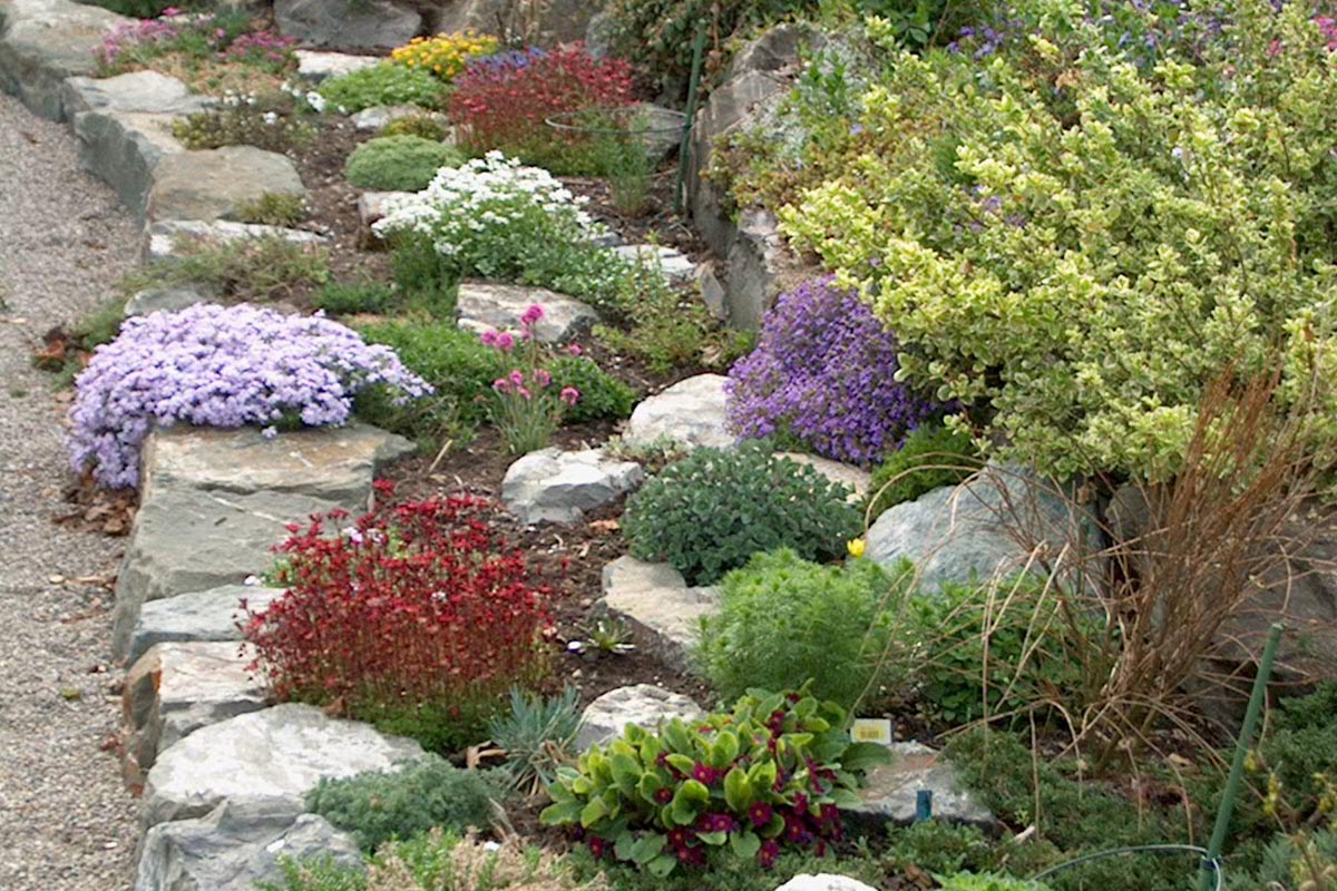 Ein Steingarten von Maimann Gartengestaltung mit großen Steinen, blühenden gelben und violetten Blumen, kleinen grünen Sträuchern und dichten grünen Hecken bildet eine üppige Kulisse im hellen Sonnenlicht.